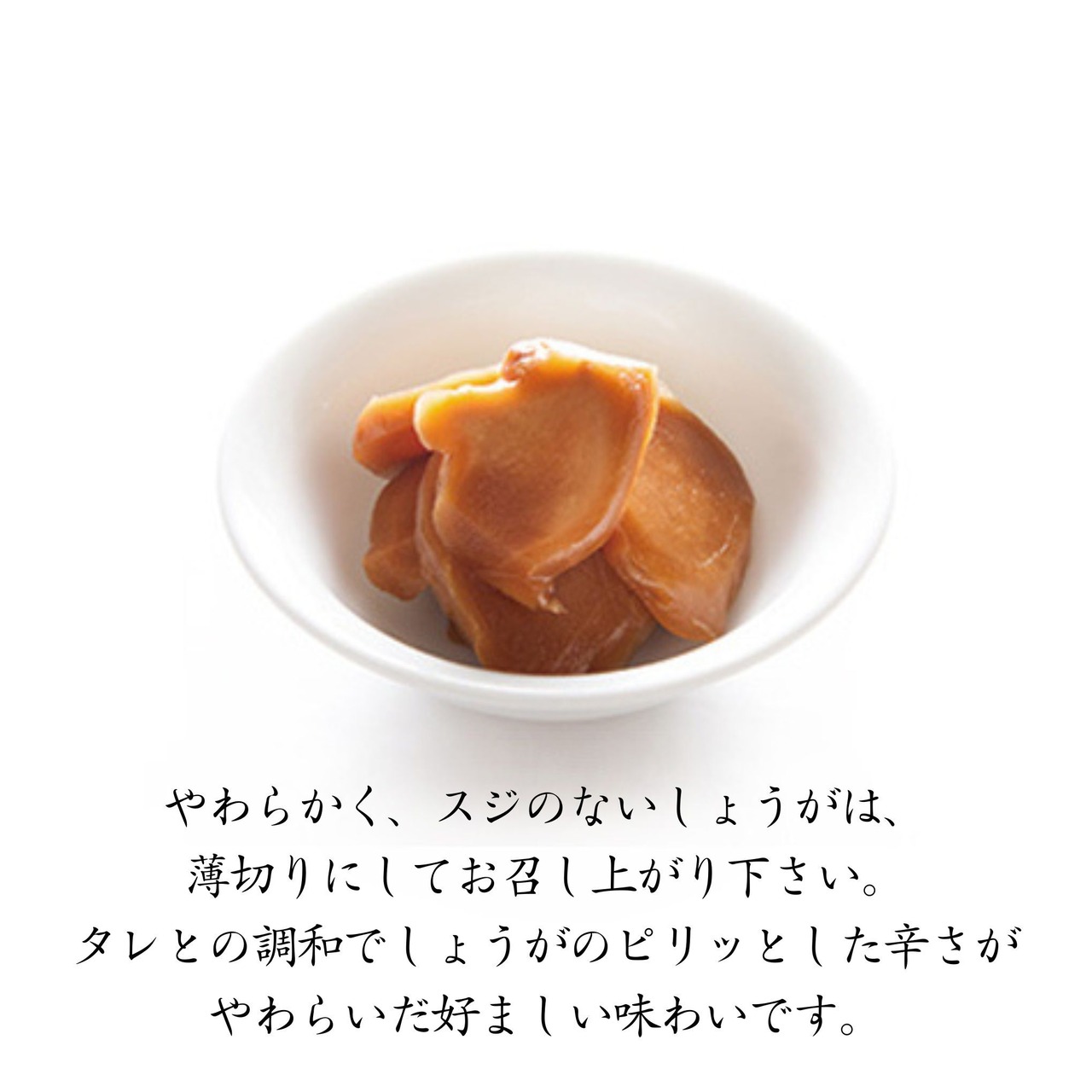 【原材料】しょうが、漬け原材料〔醤油(小麦、大豆を含む)、砂糖、清酒、ワイン、みりん、蜂蜜、異性化糖〕/ 調味料(アミノ酸等)、酸味料、酸化防止剤(ビタミンC)